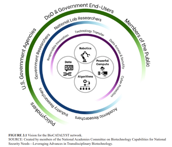 2024年12月,美国国家科学院(NAS)发布《2025年国防创新生物技术研发战略报告》,探讨了生物技术与人工智能、机器学习和实验室自动化相结合所带来的机遇和挑战,并建议建立综合研发网络“结合人工智能和实验室自动化的生物技术以产生战略技术”(BioCATALYST),以改变在国防安全应用中理解和应用生物系统的方式,使美国以前所未有的速度和效率应对国家安全挑战。