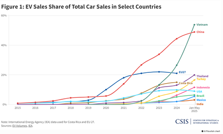 2025-08-13 美国国际战略研究中心(CSIS)在新兴市场,电动汽车(EV)的销售表现正不断突破预期,其增长速度甚至超过了许多发达经济体。但这一趋势远不止于销售数据——事实上,电动汽车制造能力和电池产业链建设也在同步提升。这一现象为华盛顿及其他地区决策者揭示了若干具有深远意义的关键问题: