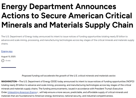 2025年8月13日,美国能源部(DOE)宣布,计划发布总额近10亿美元的资助机会通知(NOFO),用于推进和扩大关键矿产和材料供应链关键环节的采矿、加工和制造技术。该资金公告是根据特朗普总统的《释放美国能源》行政命令发布的,将有助于确保关键矿产和材料的供应更加安全、可预测且价格合理,这些矿产和材料是美国能源主导地位、国家安全和工业竞争力的基础。