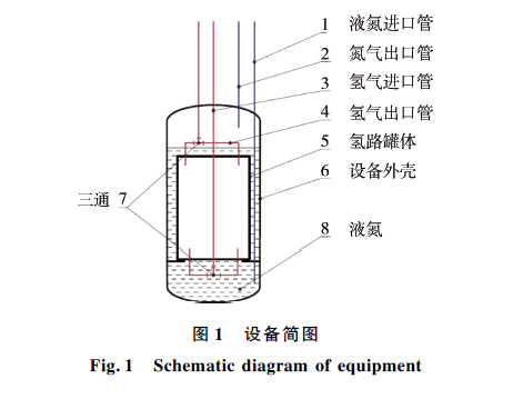 本研究液氮预冷设备结构简图如图1所示。该设备制造时,中间的氢气容器5由焊接在外壳6上的不锈钢板支承,并通过与5、6焊接连接的氢气进出管路固定其位置,使其在竖直状态下有一定的结构强度,不会左右窜动。设备工作时从1充入液氮,蒸发出来的氮气从2排出,从3充入氢气并从4流出,氢气流动过程中通过周围的液氮逐渐冷却到液氮温度,再进入系统内的其他设备中。其中氮气压力约为常压,氢气压力在1MPa左右,该设备工作时置于真空环境以减少冷量损失。