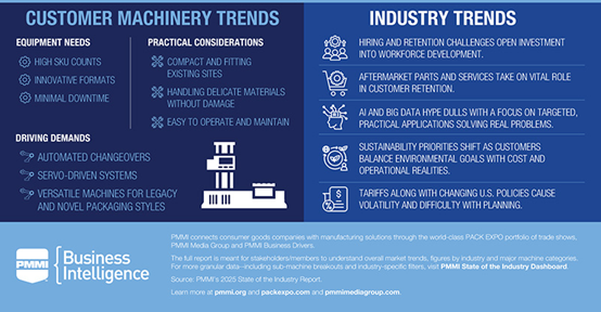 总体而言,包装机械制造商面临的核心任务是设计紧凑型设备:既要适配现有厂房空间,又能无损处理易碎材料,同时确保操作便捷与维护简便。影响行业发展的其他因素还包括劳动力挑战、人工智能应用、可持续性要求以及美国政策变革。