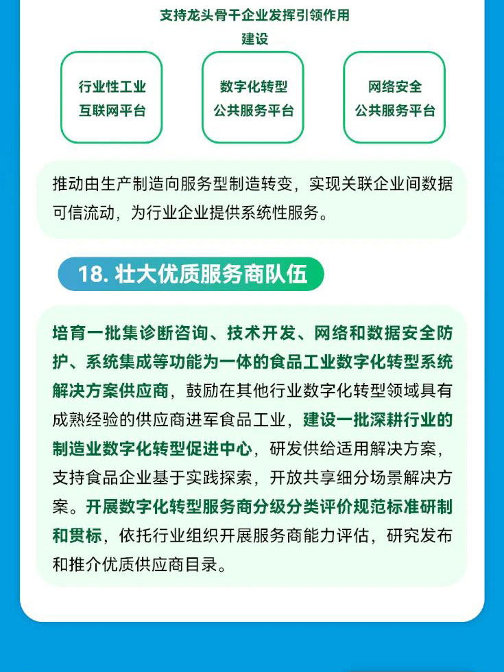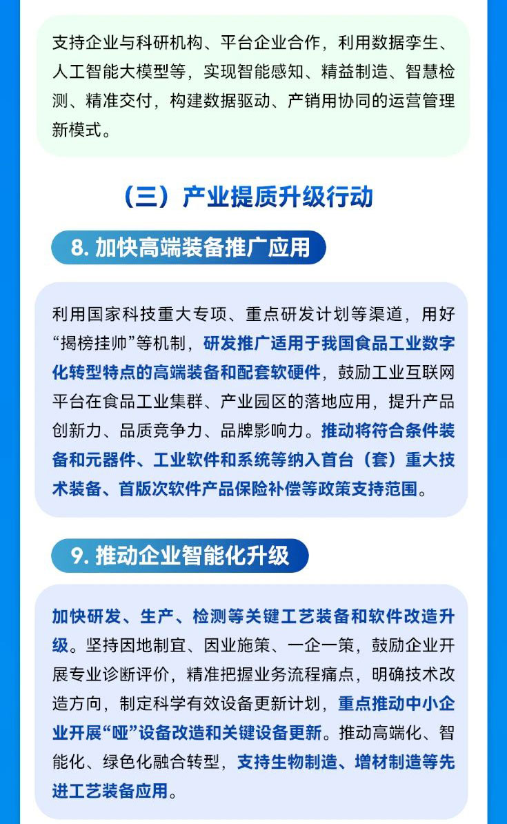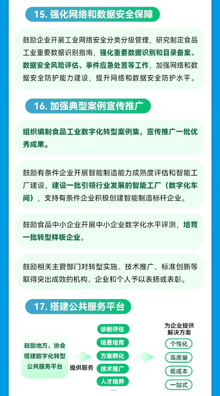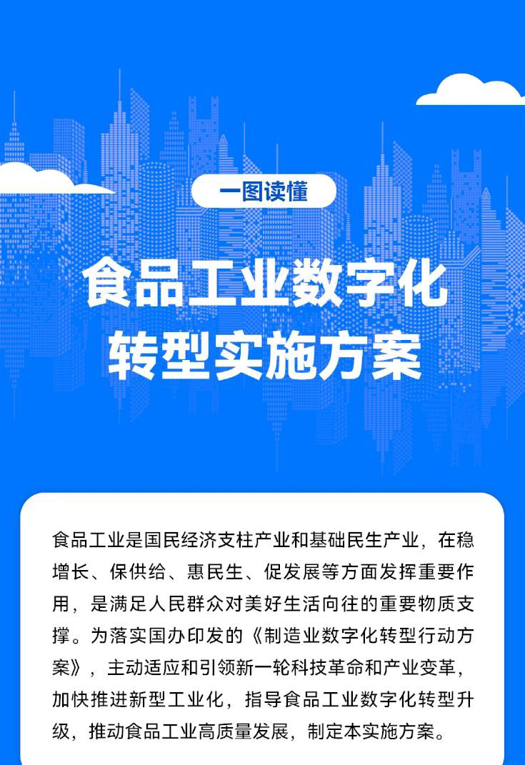 2025-06-25 工业和信息化部食品工业是国民经济重要支柱产业,对推动乡村产业振兴、带动居民就业增收、加快构建新发展格局具有重要作用。工业和信息化部等七部门近日联合印发《食品工业数字化转型实施方案》,加快新一代信息技术在食品工业全链条、全方位深度应用,推动食品工业转型升级和高质量发展。为更好理解和落实《实施方案》,现就有关内容解读如下。