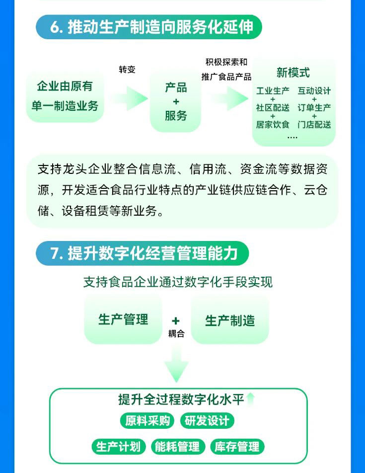 通过数字化转型带动模式创新、流程再造以及效能提升,提升企业创新能力、优化供给水平、打造知名品牌,为食品工业巩固传统优势、培育新兴动力提供重要结合点和动力源泉。如品种创新方面,通过消费大数据驱动食品产品设计的迭代创新、通过AI辅助精准营养食品创制,实现食品关键风味指标挖掘及品质智能化调控,开展大规模个性化研发定制等;品质创新方面,实现智能调度排产与精益生产管理,依托物联网、区块链等技术打造食品产品全生命周期可追溯体系等;品牌创新方面,通过全域营销助力优质品牌塑造,推动地方特色食品品牌加快融入全国大市场等。