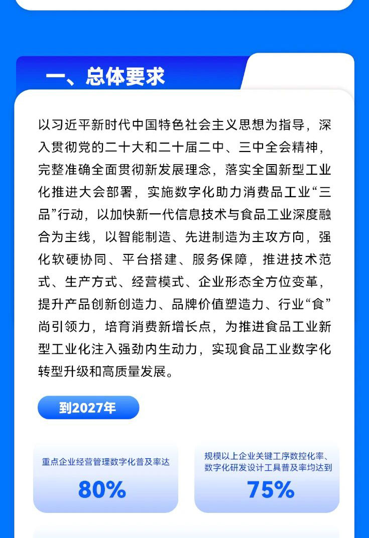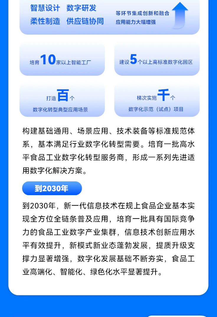 《实施方案》提出,到2027年,重点企业经营管理数字化普及率达80%,规模以上企业关键工序数控化率、数字化研发设计工具普及率均达到75%,培育10家以上智能工厂,建设5个以上高标准数字化园区,打造百个数字化转型典型应用场景,梯次实施千个数字化示范(试点)项目,培育一批高水平食品工业数字化转型服务商,形成一系列先进适用数字化解决方案。到2030年,新一代信息技术在规上食品企业基本实现全方位全链条普及应用,培育一批具有国际竞争力的食品工业数字产业集群。