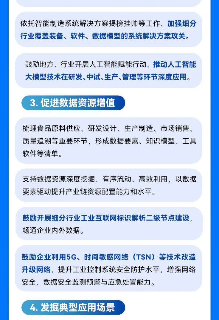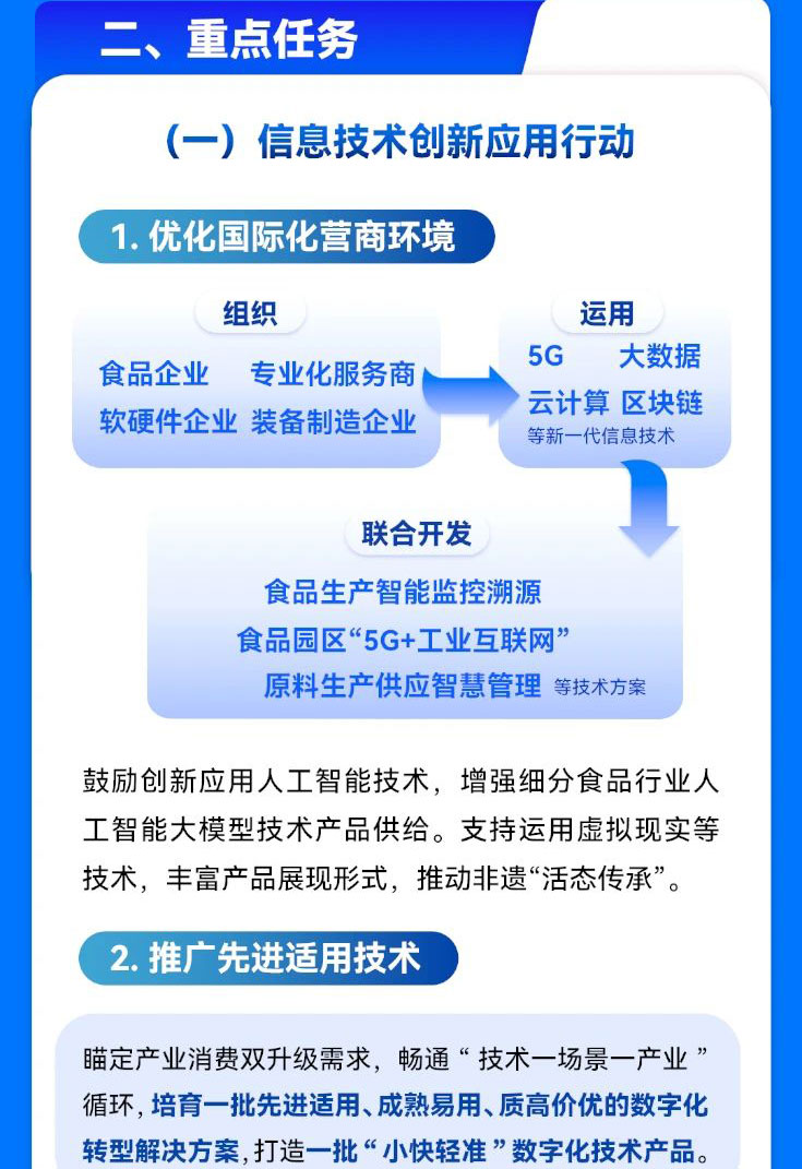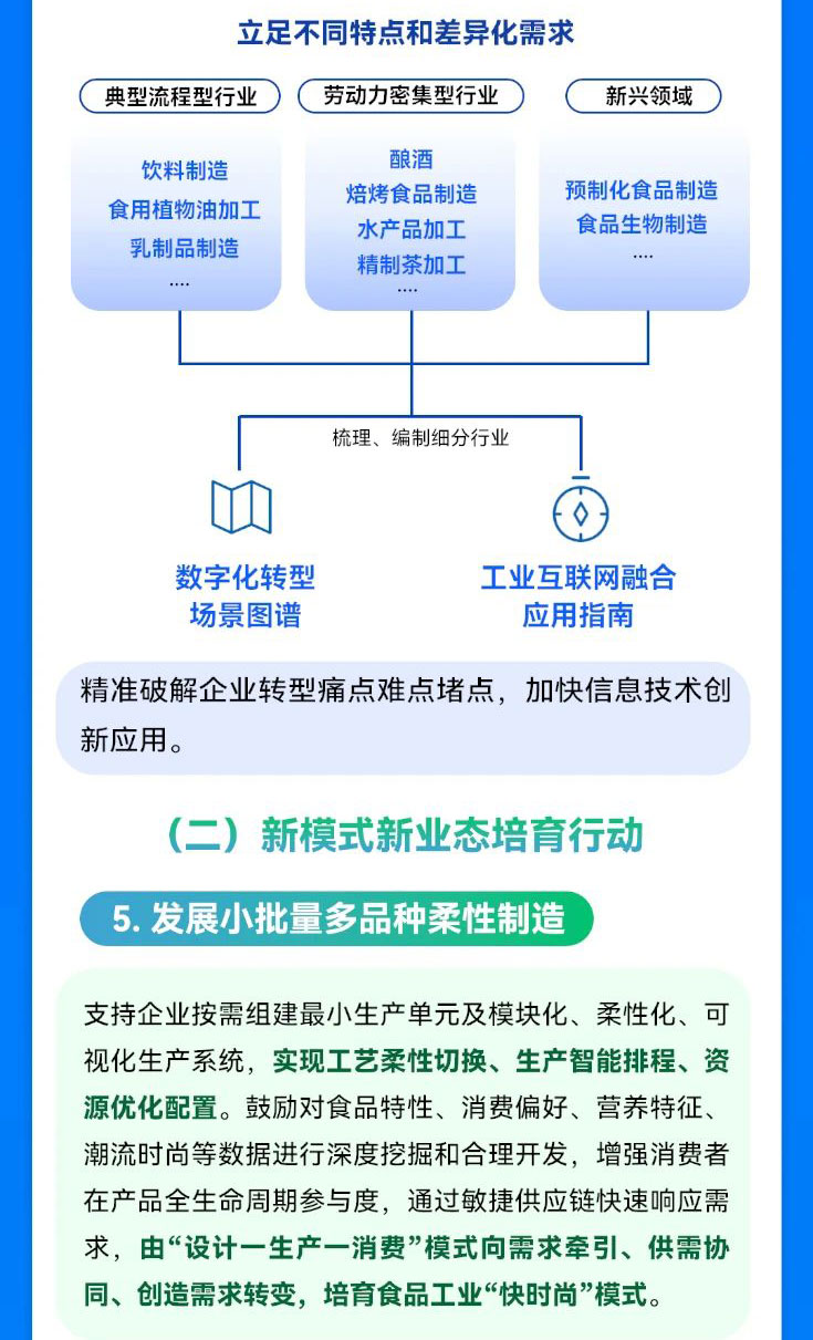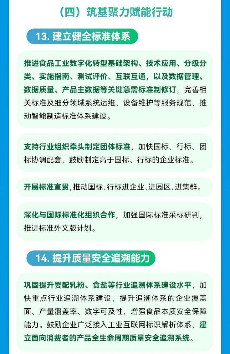 围绕目标,《实施方案》部署信息技术创新应用、新模式新业态培育、产业提质升级、筑基聚力赋能4大行动,并细化18项具体措施,对细分领域加强分类指导,坚持因地制宜、因业施策、一企一策,强化软硬协同、平台搭建、服务保障,以场景化推进技术范式、生产方式、经营模式、企业形态全方位变革,为推进食品工业新型工业化注入强劲内生动力。