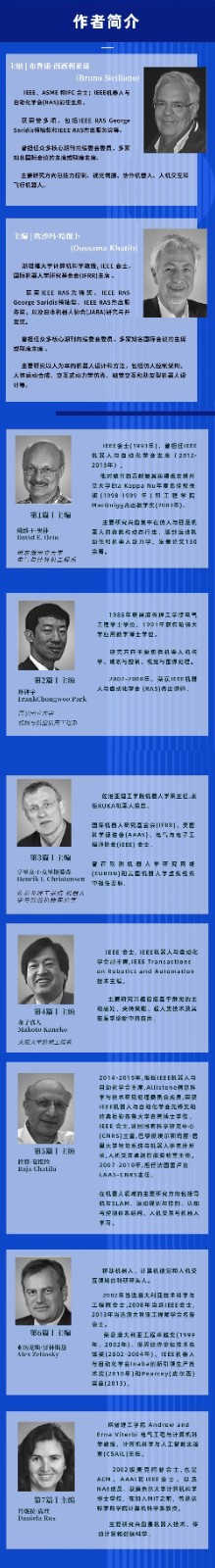 本书由前IEEE机器人与自动化学会主席布鲁诺,西西利亚诺及国际机器人学研究基金会(IFRR)主席欧沙玛,哈提卜组织,来自自斯坦福、麻省理工、东京大学、剑桥大学等顶级院校及研究机构的229位专家学者联合编写。