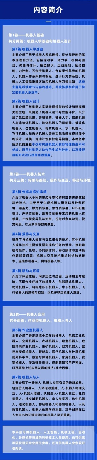 这套书全面涵盖了机器人技术的基础理论,核心技术以及各领域的工程应用案例。说实在的,机器人主要的发展方向都在交叉领域中,你不可能对海量跨学科知识都有了解,所以身边有一本这样的百科全书非常重要,遇到问题随时查非常有必要。