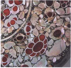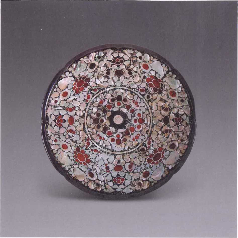 用贝壳内壁制成图案后粘贴于铜器表面,研磨后再雕花,形成光彩莹润的艺术效果。曾作为重要的御赐品。