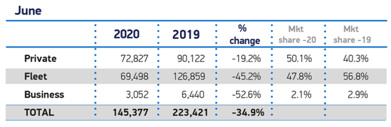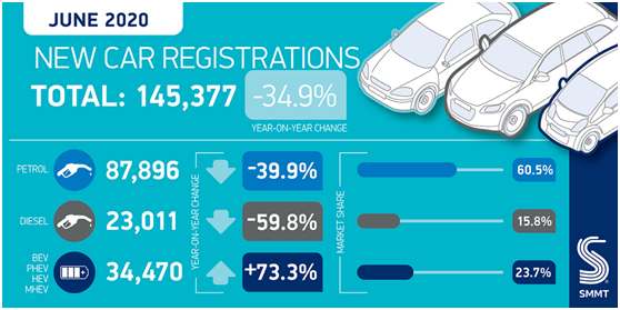 根据汽车制造商和贸易商协会(SMMT)发布的数据,6月份英国新车注册量为145377辆,同比下降34.9%,相比5月(-89.0%)有所改善,原因是在两个多月的禁售后市场开始尝试性重启。但是与2019年6月相比,仍显著下降78,044辆,因为威尔士和苏格兰的经销店在本月大部分时间都关闭。