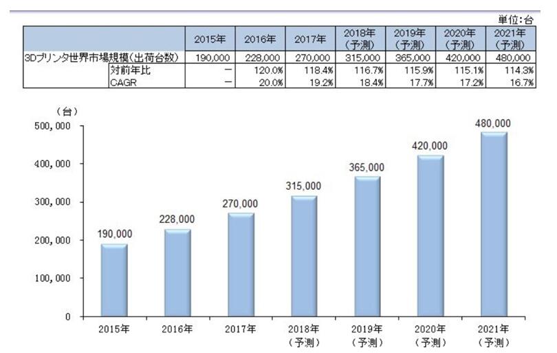 在上述背景下,预计2015年至2021年,全球3D打印机的市场规模(按照制造商出货量计算)的年均增长率(CAGR)将达到16.7%。预计到2021年,全球3D打印机的市场规模将达到48万台。