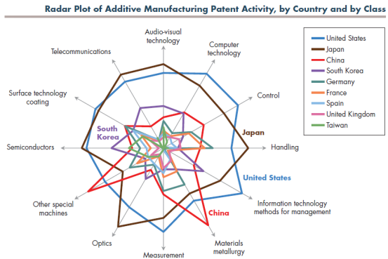 报告中选出了当今在3D打印技术领域最为领先的九个国家。无论是在专利总量还是在各类技术的发展水平上,美国和日本均处于领先地位,不分伯仲。不过,报告认为,中国是3D技术领域的“后起之秀”,整体实力不容小觑。与从1980年代中期就开始发力的美国不同,中国的大部分技术成果都是在2005年之后逐渐取得突破的。