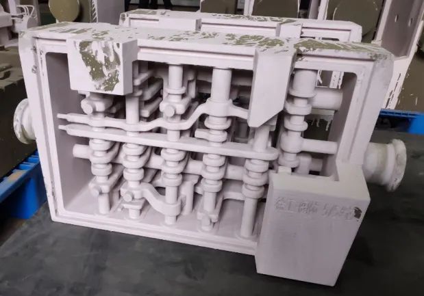 解决措施:采用3D打印形式整体造型,双层管、机体内腔芯、复杂内腔结构等问题迎刃而解。最复杂产品仅需分成5块砂芯