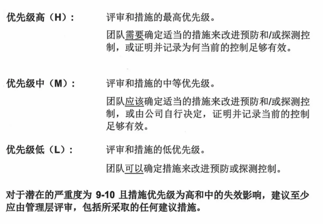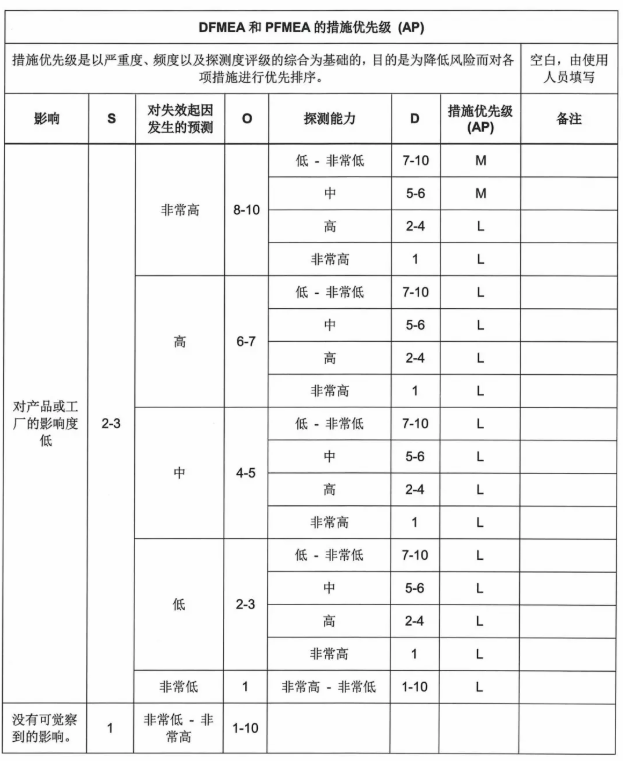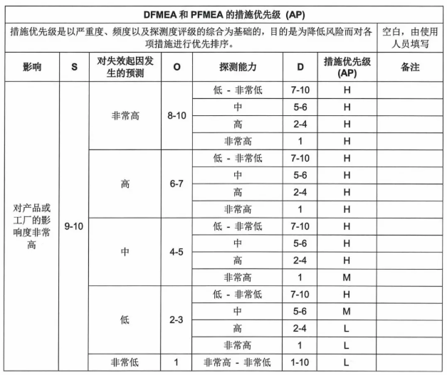 增加风险控制措施优先级AP表格,取代RPN。根据不同的S(严重性)、O(可能性)、D(可探测性) 组合,可以通过查表确定相应的风险控制措施的优先级(AP)