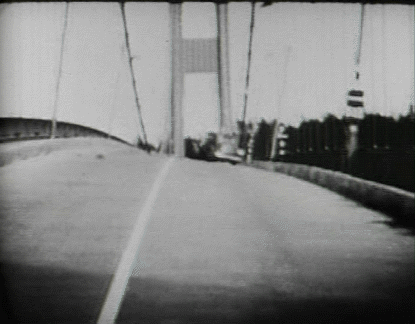 1940年11月7日,技术人员在7:30测得风速为38英里/小时,两小时后增强至42英里/小时,而此时的塔科马海峡吊桥,桥面波浪形起伏已达1米多。疯狂的扭动使得路面一侧翘起达8.5米,倾斜达到45度。而这一切刚好被正在附近拍摄电影的团队收入镜头当中,留下了珍贵的影像。