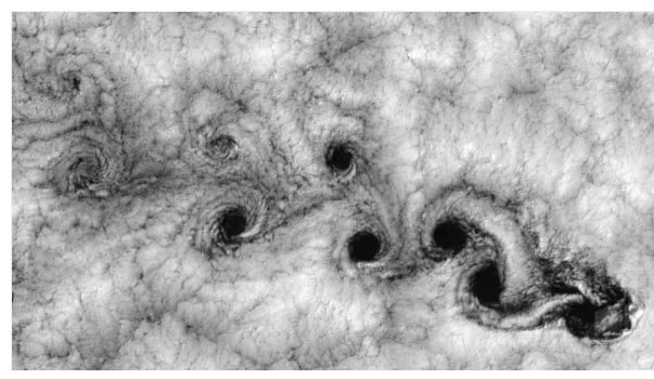 比如在水流中插一根木桩,在特定条件下木桩下游的两侧,会产生两道非对称排列的旋涡。这两排旋涡旋转方向相反,相互交错排列,就像街道两边的街灯一样。