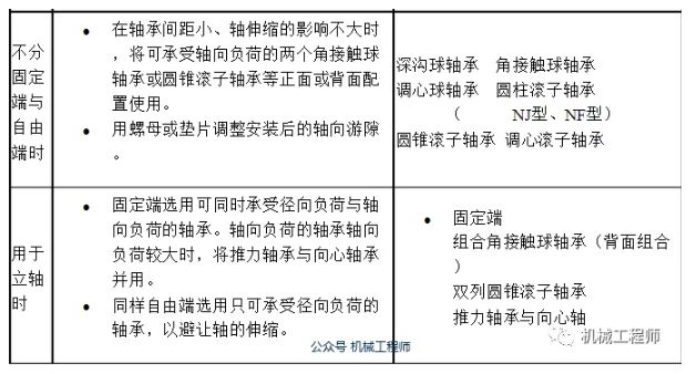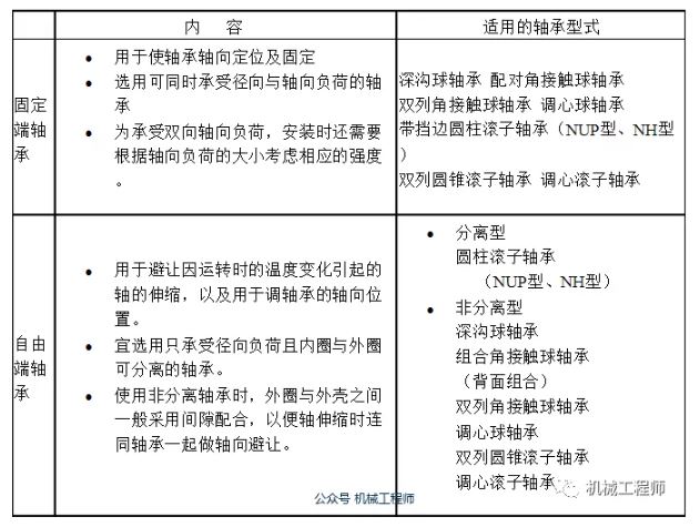 而且,为了便于轴向定位,使用时大多将一个轴承用作固定端轴承,其余则用作自由端轴承。下表列出了固定端与自由端轴承结构的选择。