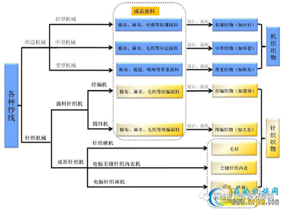 纺织机械涵盖了从纤维织造到服装成型过程中的所有加工设备,具体包括化纤机械、纺纱机械、织造机械、针织机械、染整机械、非织造机械、服装机械及纺织器材八个相对独立的子行业。各种机械以及在纺织过程中所处的环节如下: