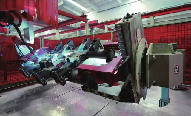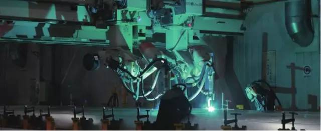 在这里,车体加工的长焊缝全部由机器人完成,小的部位由人手工焊接。