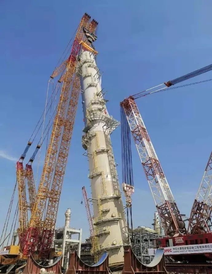 这是2021年9月9日,海南项目乙烯装置急冷水塔起吊现场,吊装总重达1141.1吨。历时3个小时,4000吨履带式起重机将急冷水塔顺利吊装就位。中石化重型起重运输工程有限责任公司是中国石化直属的专业工程企业。公司集中了中石化炼化工程板块内全部的重型起重运输资源,亦是中国石化集团唯一的起重运输公司,拥有世界最大的4000吨履带式起重机和超3400吨承运能力的运输资源。