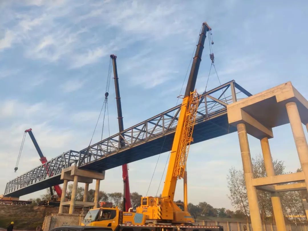 这是2021年11月12日,在安徽芜湖石油6.4万立方米库容新油库,安徽芜湖油库搬迁工程项目建设现场,正在吊装的是使码头与库区贯通的跨堤钢桁架,净重98吨,该项目于2021年12月中交。