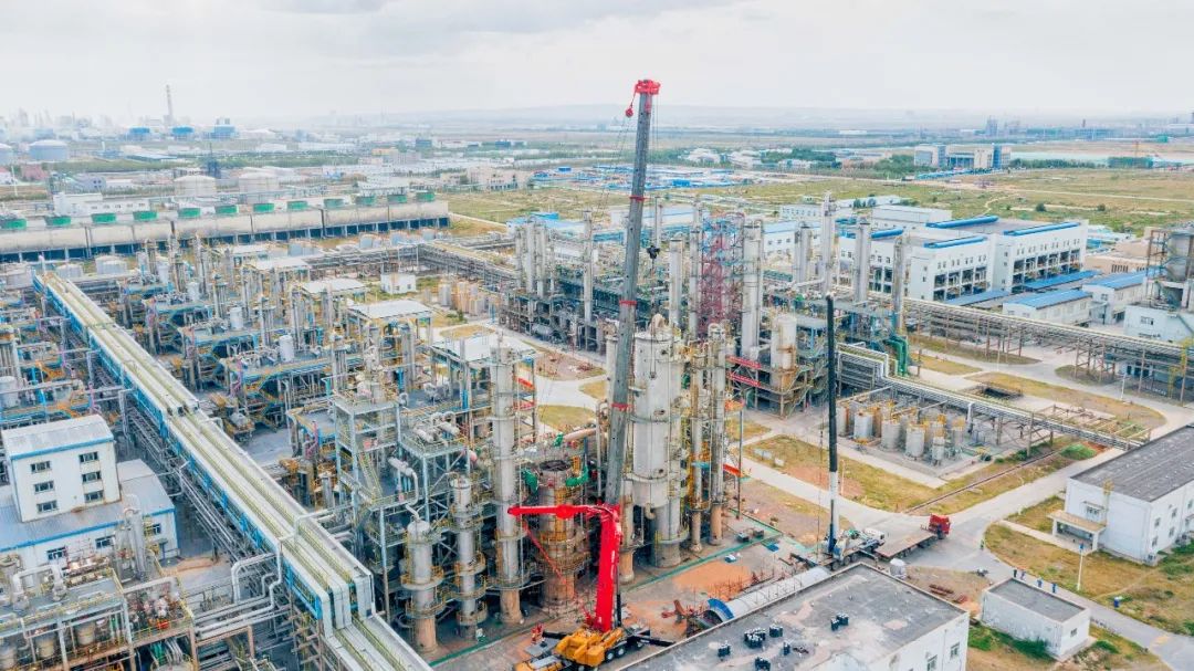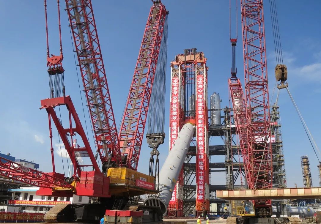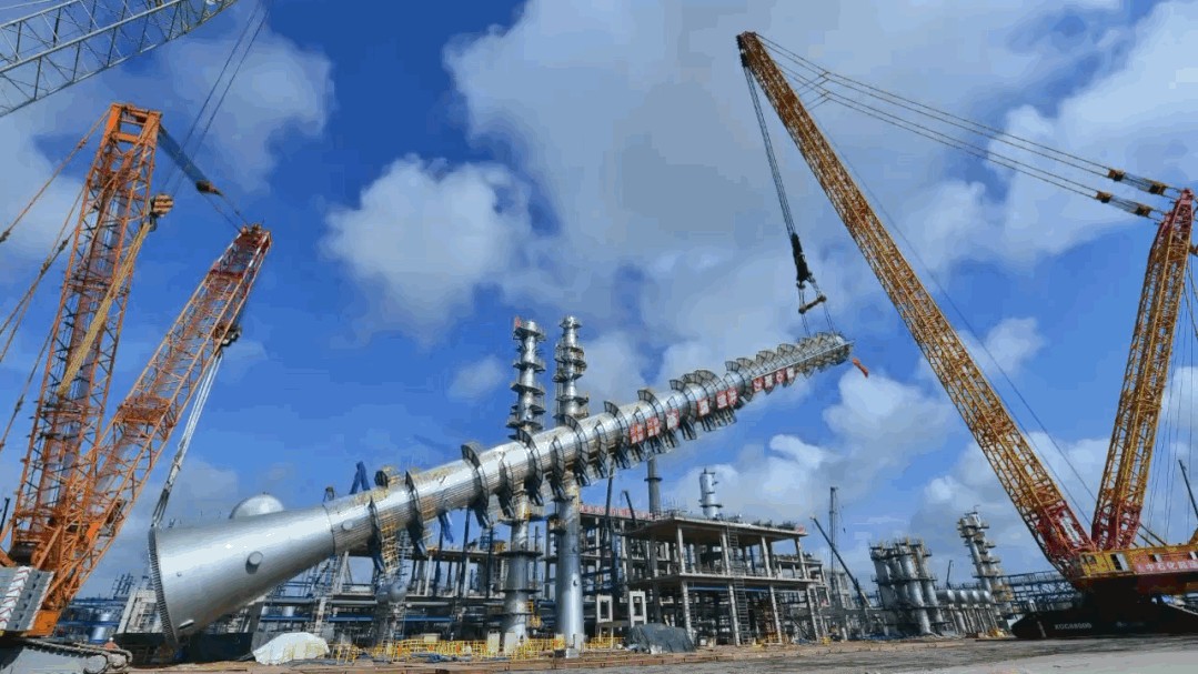 这是2019年7月22日,在中科炼化200万吨/年轻烃回收装置建设现场,正在吊装的是该装置脱异丁烷塔,由世界最大吨级的履带吊车——4000吨吊车吊装完成。该装置于2020年6月投产,目前安全平稳运行,产生约10吨/时的正丁烷、5吨/时的异丁烷与5吨/时丙烷。