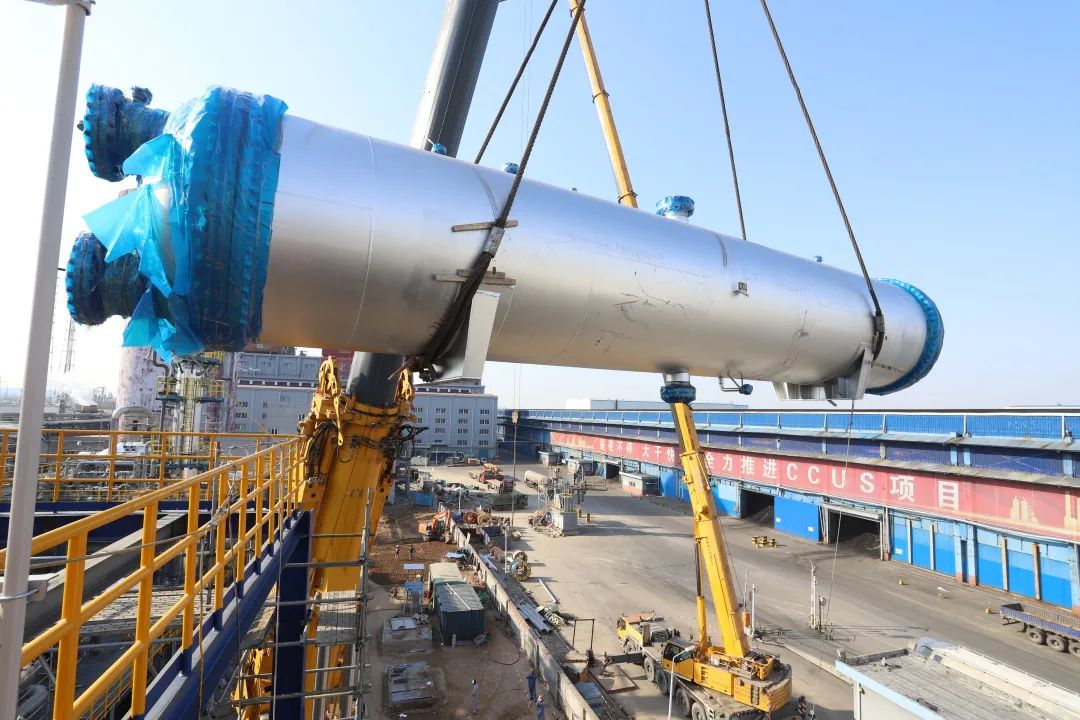 这是2022年1月16日,齐鲁石化-胜利油田CCUS项目建设现场,正在吊装的是项目最后一台大型静设备丙烯冷凝器,净重83.6吨。该项目已于1月29日全面建成中交,是目前我国首个百万吨级CCUS(二氧化碳捕集、利用与封存)项目。