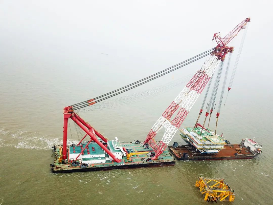 这是2020年,石油工程建设公司胜利油建公司承建的江苏如东H5#海上升压站项目施工现场,正在吊装的是上部组块,该升压站分为上部组块、导管架和钢管桩三部分,总重约3915吨。该项目于2021年10月31日实现项目全容量并网,是当时全国国内吊装完成项目中重量最重、单根交流海缆78公里路由最长、海上高抗容量最大的海上风电场平台。