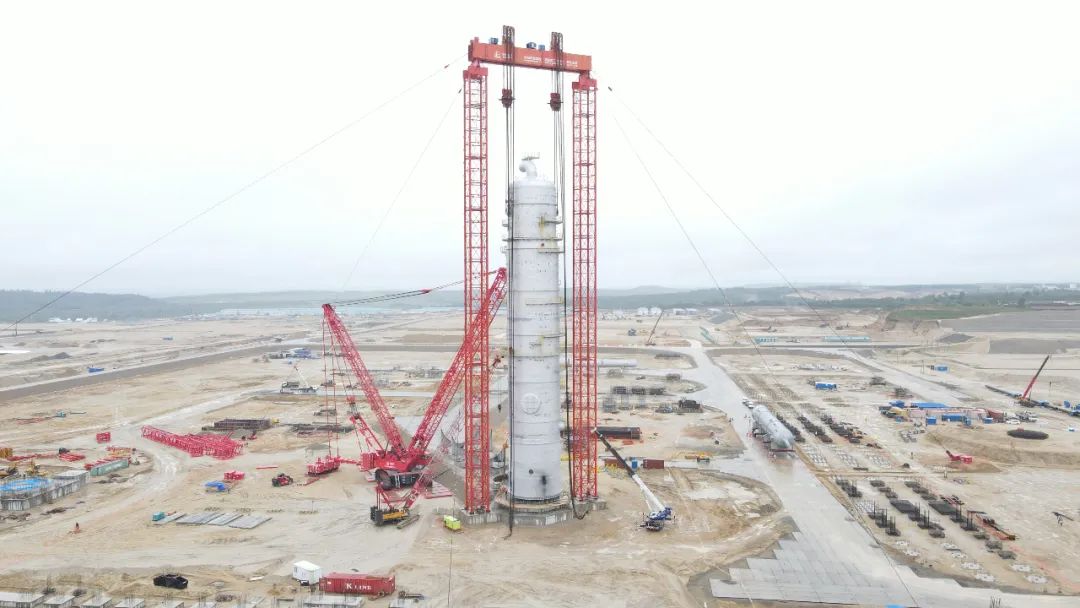 这是2021年8月22日,由中石化起运公司承吊的俄罗斯阿穆尔天然气化工厂(AGCC)急冷塔顺利吊装现场。此次吊装的设备重1500吨,为厂区中最重的设备,也是俄罗斯AGCC项目安装就位的首台设备。