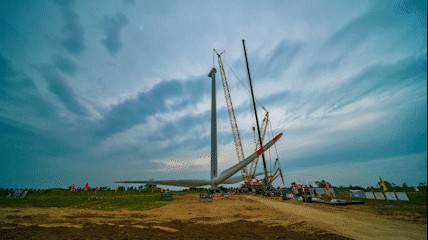 这是2021年,在新星公司陕西渭南大荔20兆瓦风电项目建设现场,正在吊装的是首台2.5兆瓦风机的主部件之一轮毂和叶片,净重65吨。该项目于2021年12月14日实现并网发电,是中国石化首个陆上分散式风力发电项目。