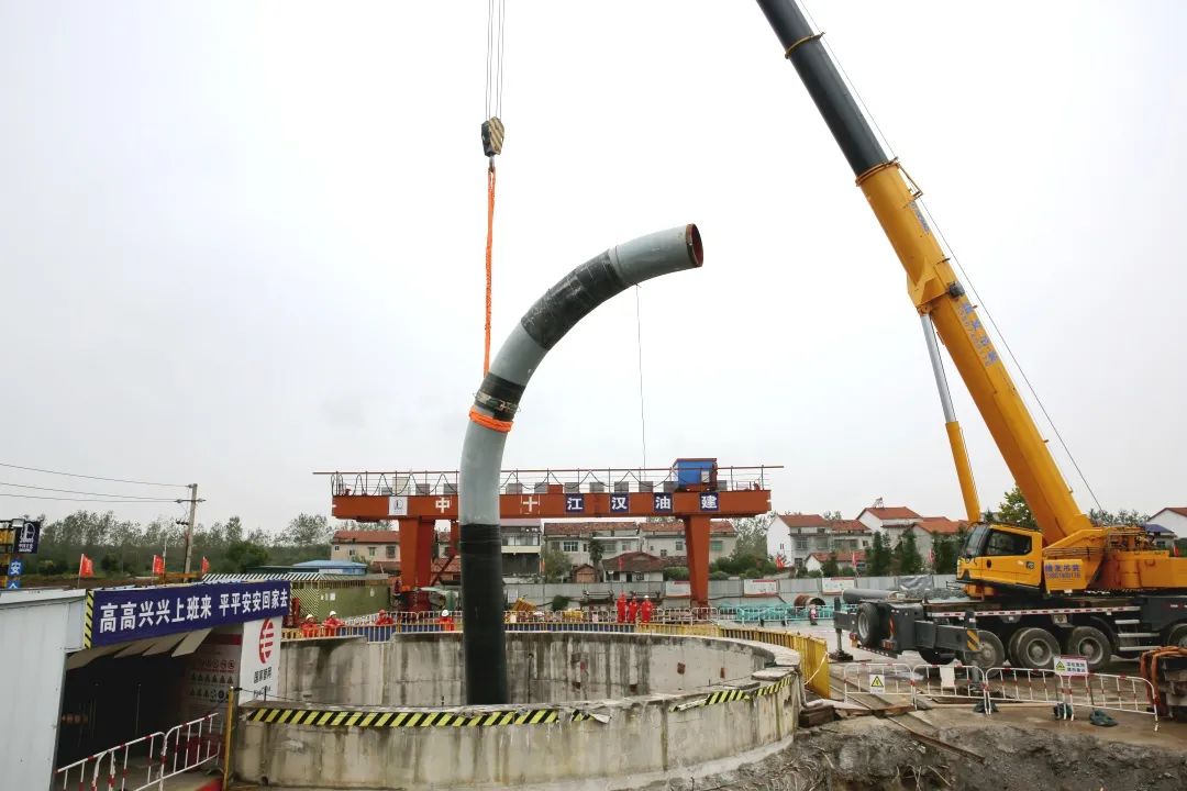 这是2021年10月,在石油工程建设公司江汉油建公司承建的新疆煤制气潜江-韶关输气管道长江盾构管道安装穿越工程建设现场,吊装隧道管道与线路主管道连接的S弯管,一根长达20米,重20吨。该工程是国内最长盾构大管径管道安装穿越工程。目前,正在进行该工程的水土保护等附属项目,还未正式运行。