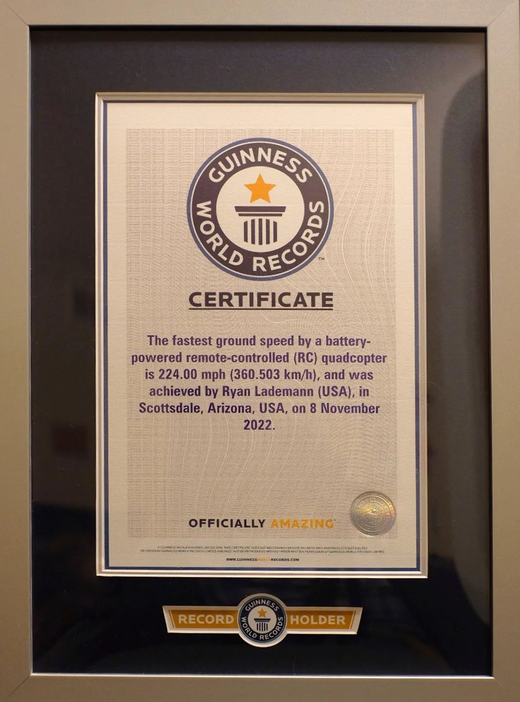 他的第一项成就引起了一些专业人士的注意,帮助优化了他的无人机的空气动力学;随后的几年,Ryan不断更改了无人机的框架,从XLR 1到XLR V3,他的无人机速度越来越快,直到今年一月,创下了吉尼斯世界纪录——360km/h。
