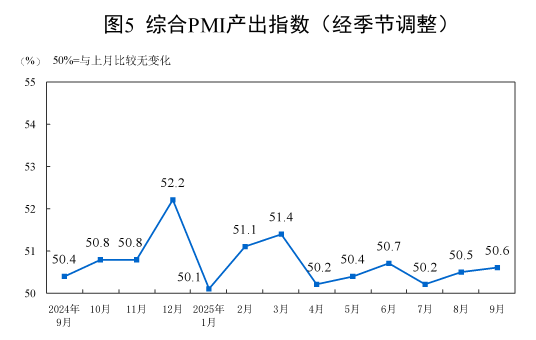 9月份,综合PMI产出指数为50.6%,比上月上升0.1个百分点,持续高于临界点,表明我国企业生产经营活动总体扩张继续加快。