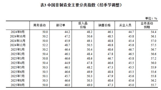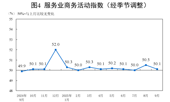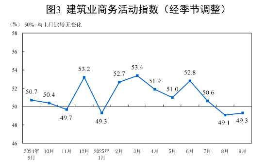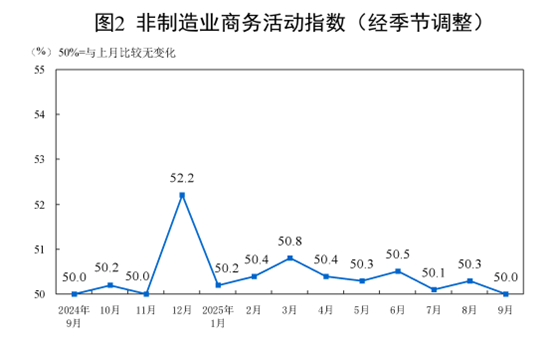 9月份,非制造业商务活动指数为50.0%,比上月下降0.3个百分点,位于临界点,非制造业业务总量总体稳定。