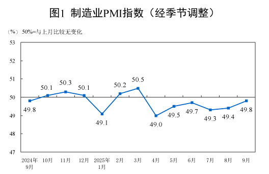 9月份,制造业采购经理指数(PMI)为49.8%,比上月上升0.4个百分点,制造业景气水平继续改善。