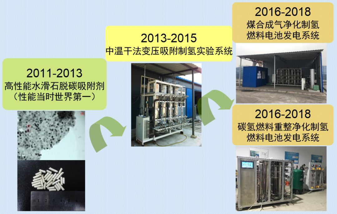 本技术专利设计并合成了一种新型钾修饰长碳链柱撑的水滑石吸附剂,可深度脱除H2S、CO2,同时依据吸附增强水气变换深度净化CO,可以使得产品氢气在收率与纯度上达到双高。其比常温变压吸附净化优势在于净化选择性和深度;对比工业大规模常温低温湿法净化优势在于更为简单的工艺及较低的投资运行成本。在此基础上,新公司初期主要业务集中在化石燃料制氢设备及高纯氢设备与高纯氢气体、相关技术及服务方面。